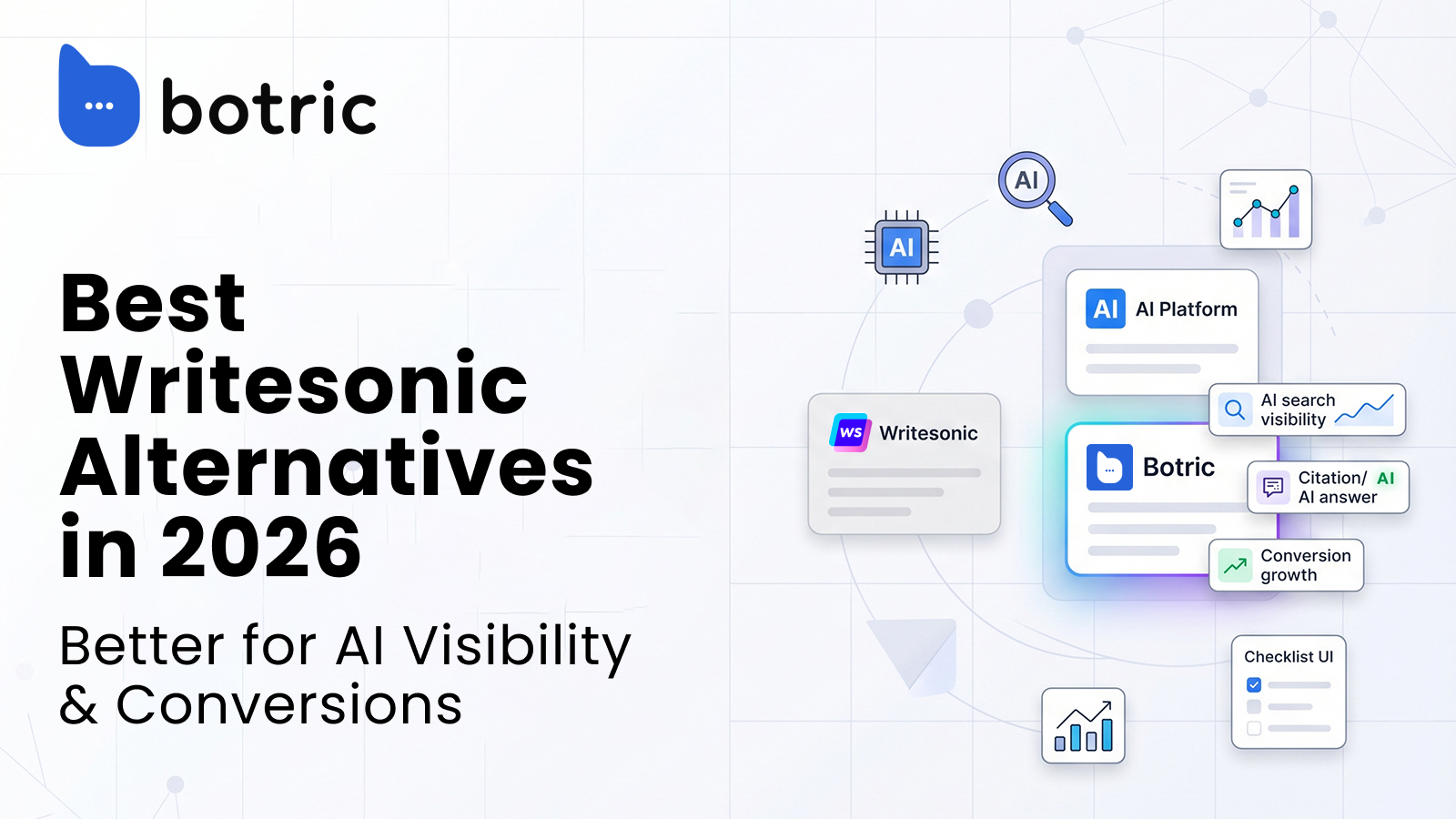 The top Writesonic alternatives are Botric AI (for AI visibility and GEO), Jasper (for content quality and brand voice), Surfer SEO (for search optimization), and Semrush (for full marketing intelligence).